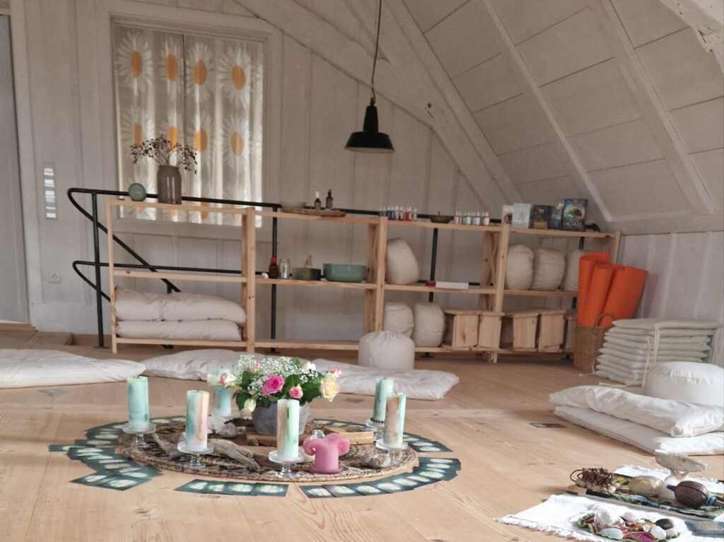Unser Sacred Space ist großzügig und hell, mit ausreichend Platz für Bewegung, kreative Übungen und tiefgehende Behandlungen. Er wurde mit viel Liebe gestaltet und bietet alles, was wir für unsere Zeit miteinander brauchen.