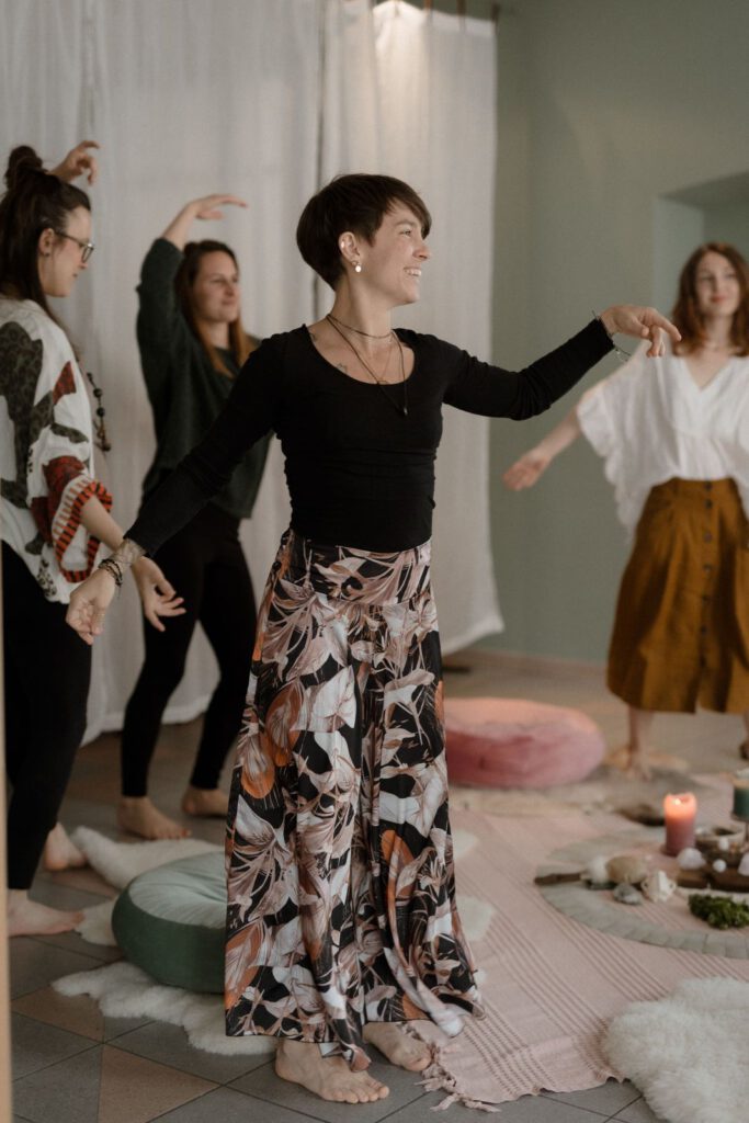 An einem anderen Abend tauchen wir in die Präsenz von Maria Magdalena ein, in die Erinnerung an Weiblichkeit, Liebe und Hingabe, oder Tanzen in der Kraft von Feuer, Wasser, Luft und Erde.